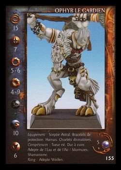 Ophyr le gardien est le gardien ... de mon étagère. Il ne sort pratiquement jamais, sinon en plus de 600 pa ou à Rag Narok ou il trouve un terrain de jeu à sa mesure. Mais ça ne fait pas de lui un monstre, c’est son prix qui le cantonne à ce format : 155 points. Et pour ce prix, 7 d’initiative, très élevée, mais 5 d’attaque et 6 de force, rien d’extraordinaire. Et que dire du magnifique 4 de défense. C’est un adepte me direz-vous, certes mais 4 quand même. Le réconfort est-il de voir son 9 de résistance avec la compétence dur à cuire ? C’est maigre. Il est vrai qu’avec 10 de peur, il faudra vous habituer à voir fuir pas mal de monde, et son 6 de discipline n’est pas du luxe.